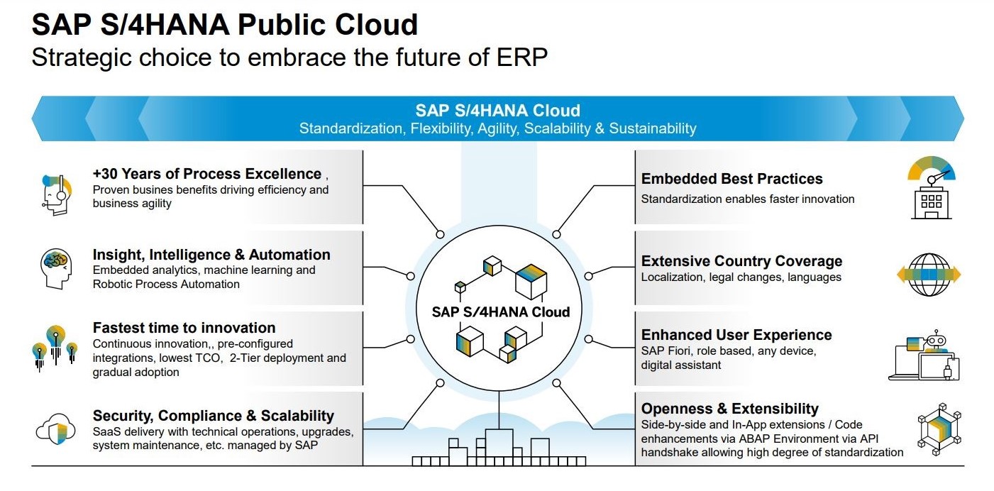 SAP S/4 HANA Cloud, public edition is a ready-to-run cloud ERP that delivers the latest industry best practices and continuous innovation.